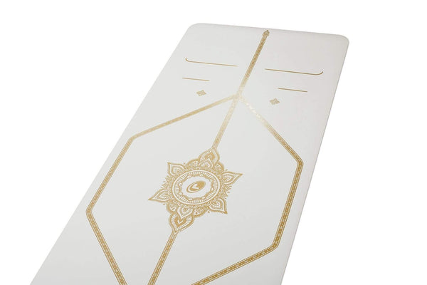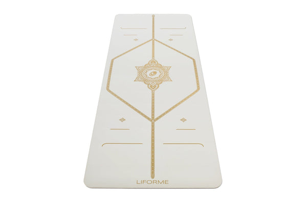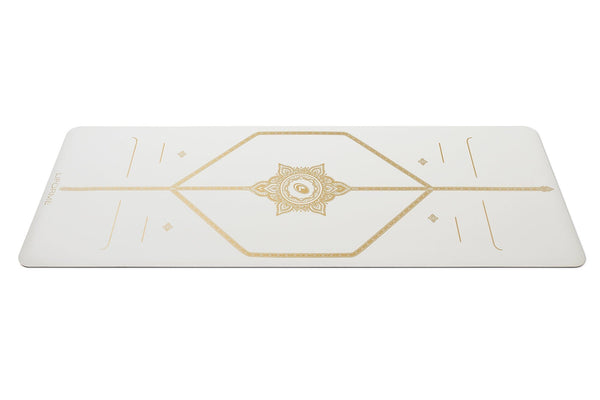 The lightweight, portable version of our Liforme 'White Magic' Mat, designed in collaboration with International Yoga teacher Kino MacGregor, features a creamy surface printed in metallic gold with our new durable, non-toxic, eco-friendly ink. Providing the ultimate grip for your on-the-go practice and keeps you safely aligned with a magical embellished version of our original unique alignment guide. Our mats are always truly planet-friendly: biodegradable, non-toxic, and PVC-free. Take the Liforme magic with you wherever you go!